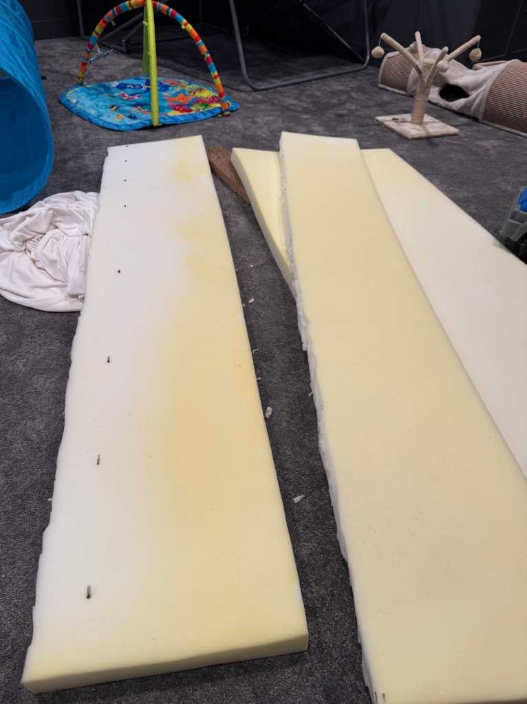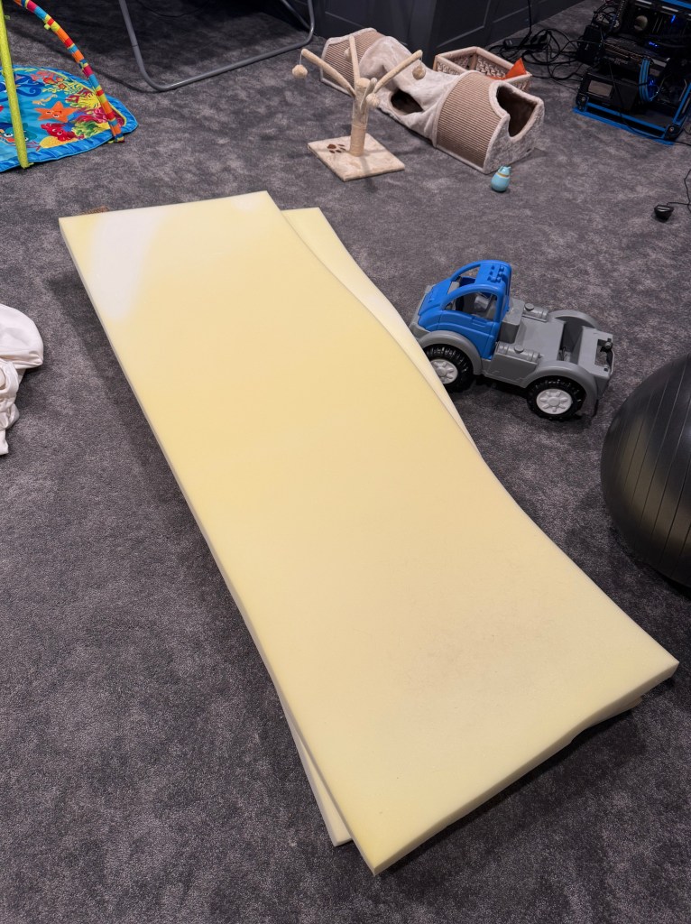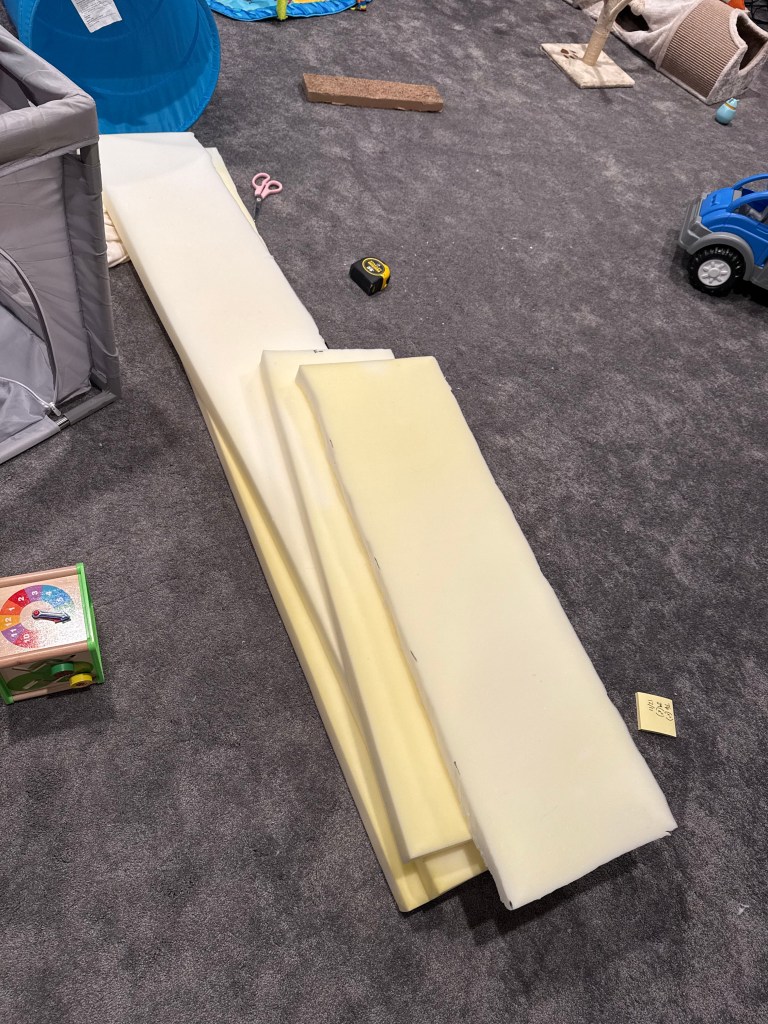 Trying to use old foam from an old baby project I did, to create crib protectors so Saiyler stops hitting her head on the damn crib. I cut the pieces to size but now I need to go pick out a cloth material and sow it to make an insert for these. I’ve already done it once before (I made Saiyler some bed guard-rails when we were co-sleeping together).