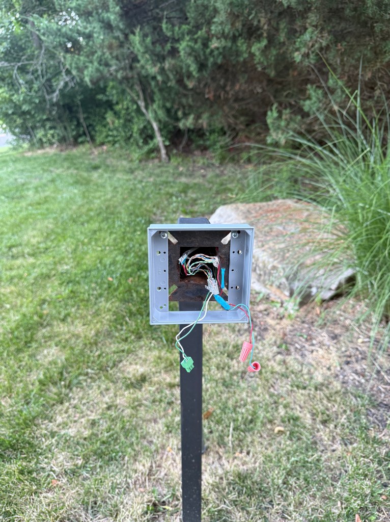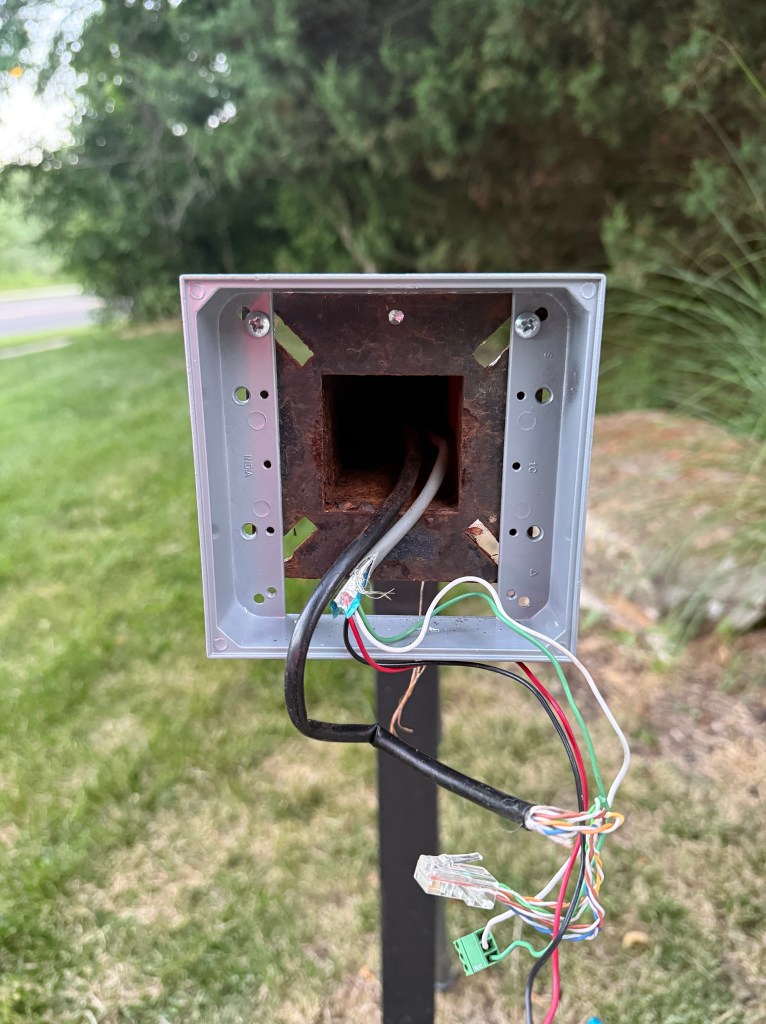 This is taking longer than I expected. I started this about 2 weeks ago, but ran into some issues with wiring and mounting options for the Ring camera we bought. I am using the doorbell elite pro from Ring with POE, but unfortunately they don’t specifically make mounts that go with gate keypads. So I’m attempting to create my own mount with this weatherproof gray box. I could also completely take out the black pole and find something a bit more compatible with the ring camera but I do not want to even attempt anymore work with wiring at the moment, especially since I’m pregnant. I don’t believe the voltage at the gate is high voltage. It’s low enough to shock me if I fuck up but not even remotely enough to kill me. Also yes I checked Etsy for 3D printed mounts but I am too lazy to wait for something to come in so this is my solution. I just need to go to Lowes or Home Depot this week and get a Cobalt drill bit so it can go into the steel.
